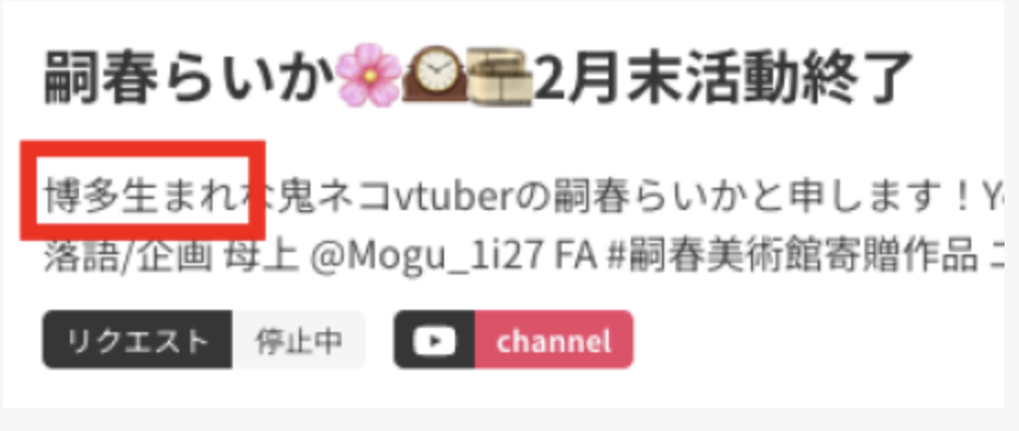 一方の嗣春らいかさんも自己紹介で「博多生まれ」とはっきり明言していて、「無大宰府編」という福岡帰省にちなんだ配信タイトルも残っているんです。