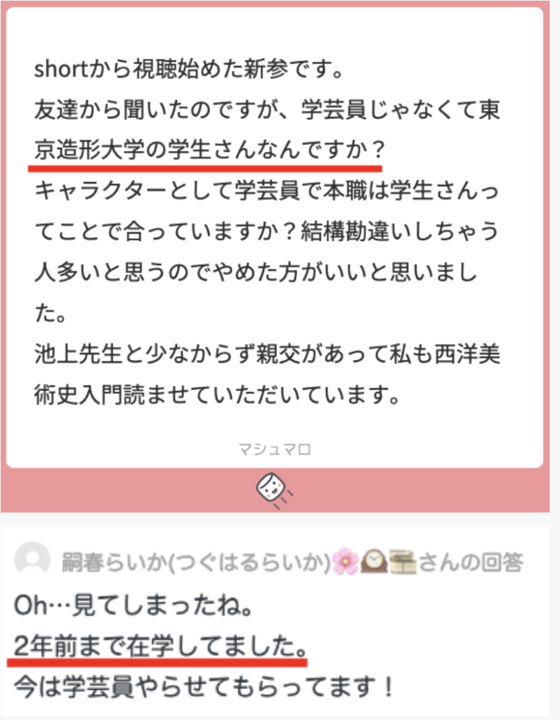 | ③東京造形大学・学芸員 | 嗣春らいか本人のマシュマロ回答 |