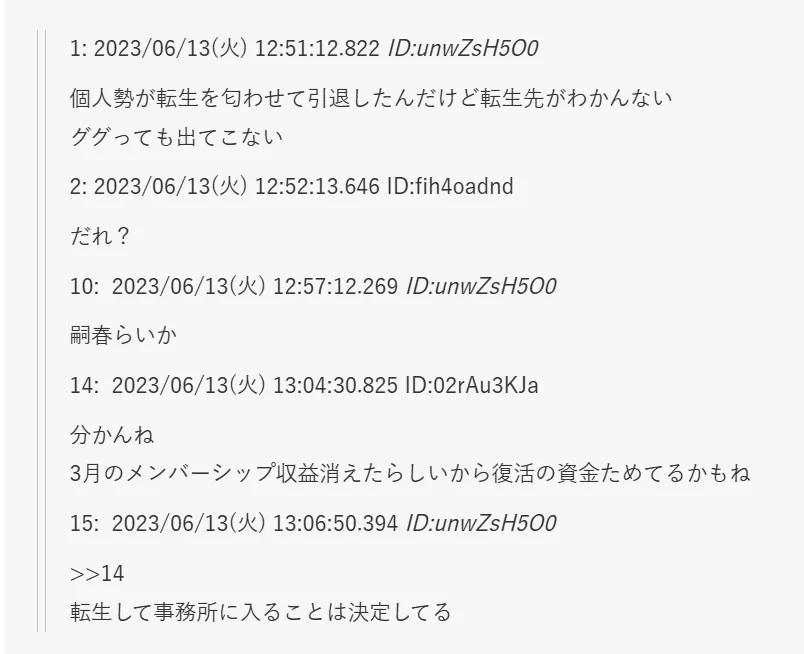 さらに、らでんさんがデビューする約3か月前の2023年6月には、5ちゃんねるに「個人勢が転生を匂わせて引退した」「嗣春らいか」「転生して事務所に入ることは決定してる」という書き込みまで残っているんです。